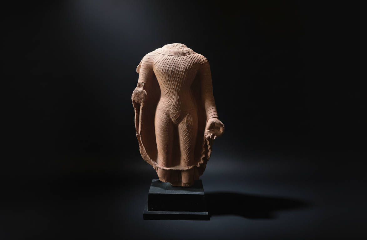 The Sandstone Torso of Standing Buddha embodies that evolution, departing from the earlier, more rigid Kushana styles influenced by Gandharan art.