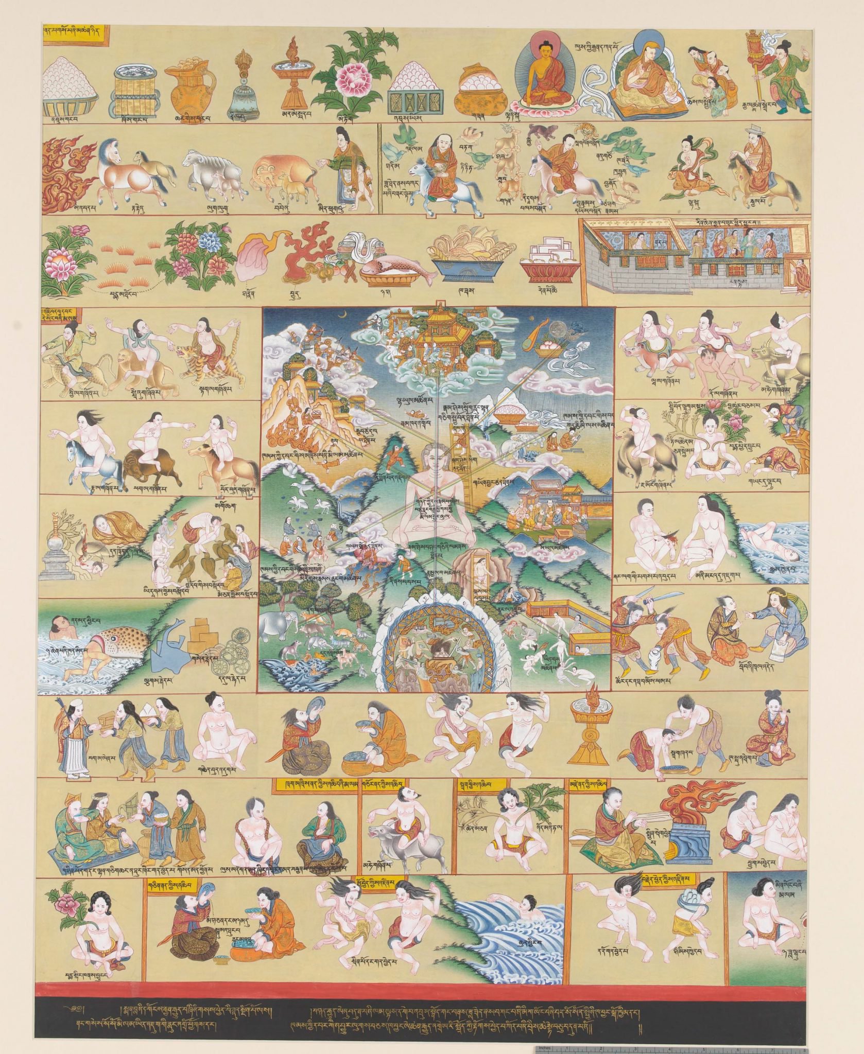 This exquisite hand-painted artwork on cotton canvas measures 74×90 cm, embodying the rich traditions of Himalayan culture and the profound insights of Vajrayana Buddhism.
