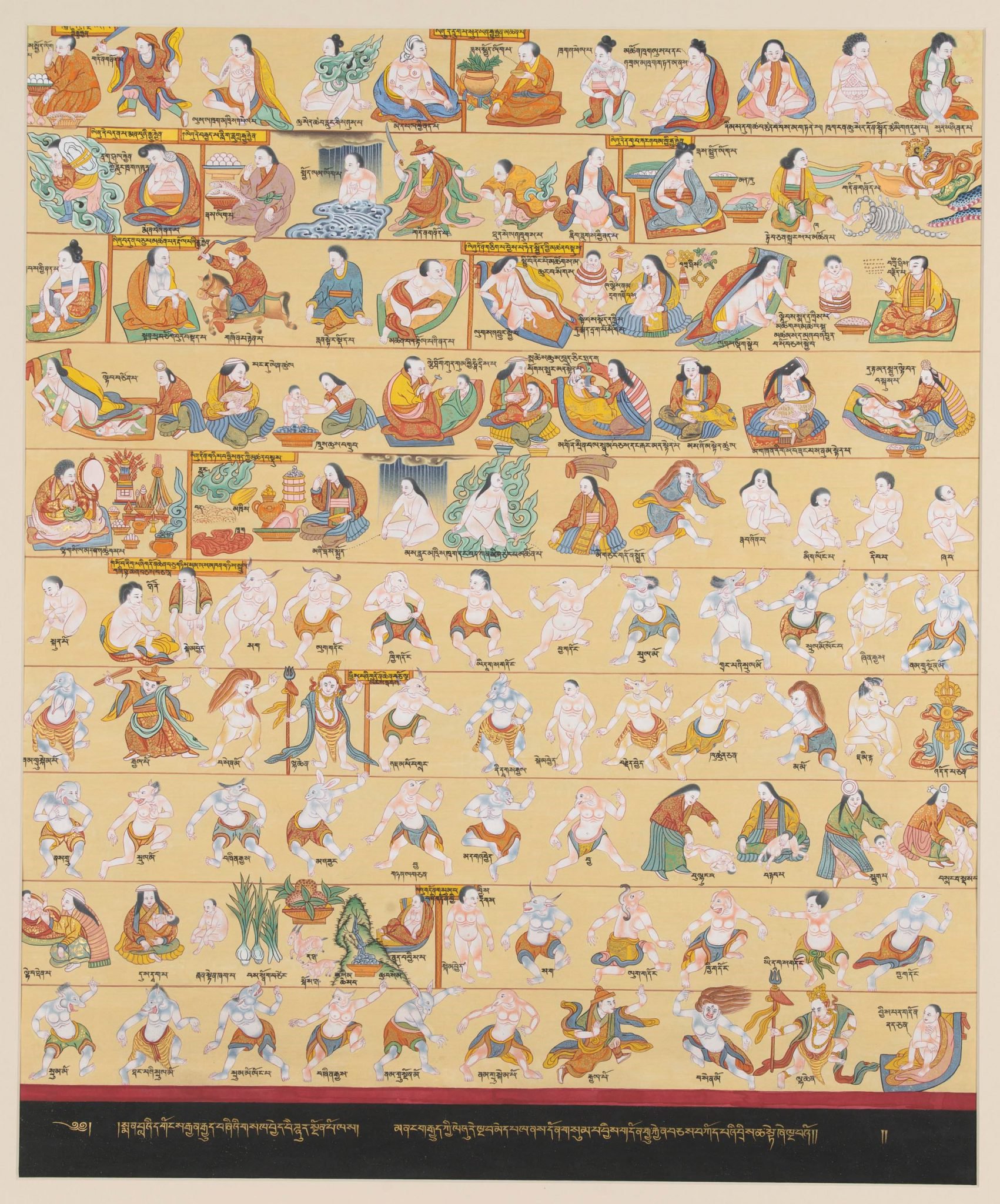Medical Painting Art – Primary and Secondary Causes of Disease depicts childbirth and newborn care, as well as birth deformities and childhood disorders. The size of this thangka is 74*90 cm.