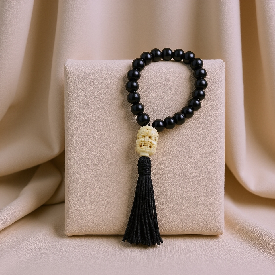 Reverence the Magnificent Black Tourmaline Stone Wrist Mala with Mahakala in Bone and Tassel