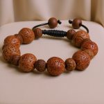 This handmade wrist mala, crafted by skilled artisans in Nepal, features a harmonious blend of Bodhi and Raktu seeds. With a total length of 12 cm, it serves as a powerful tool for meditation and spiritual practice. The Bodhi seed, symbolizing enlightenment and a deep connection to the teachings of Lord Buddha, protects the wearer from negative energies while bestowing wisdom. Similarly, the Raktu seed, sourced from the banyan tree, embodies enlightenment and wisdom, enhancing your spiritual journey. This mala is not only a meaningful accessory but also a beautiful reminder of your spiritual path.
