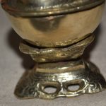 This handmade brass kapala, or skull cup, from Nepal serves as a profound symbol in Vajrayana Buddhist rituals. It embodies the transformation of ignorance into enlightened wisdom, while also reminding practitioners of the impermanence of life. The skull signifies the great bliss that arises from understanding the nature of existence and the cycle of life and death.