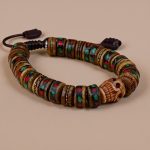 This handmade wrist mala, crafted in Nepal by skilled artisans, features yak bone beads inlaid with skull motifs, symbolizing the impermanence of life and the transformative nature of existence. In Tibetan culture, yak bone represents grounding, strength, and spiritual protection, reminding us of the endurance inherent in all beings. The brown hue of the mala signifies stability, security, and balance, fostering a deep connection to the earth and oneself. This wrist mala serves as a powerful tool for meditation, encouraging insight, awareness, and protection against negative energies.