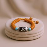 The Dzi Bead Resin Ambar Wrist Mala is a sacred tool handcrafted in Nepal by skilled artisans. This mala, featuring a blend of amber and Dzi beads, carries profound spiritual significance. Amber, a resin known for its warm, golden hue, symbolizes healing, purification, and vitality. It connects the wearer to nature and the earth’s energy. The Dzi beads, adorned with mystical patterns, offer protection and spiritual awakening, while the turquoise stone enhances communication and expressiveness, aligning with the throat chakra. This mala weighs 0.018 kg and measures 10 cm in height and 5 cm in width, serving as a powerful companion on your spiritual journey.
