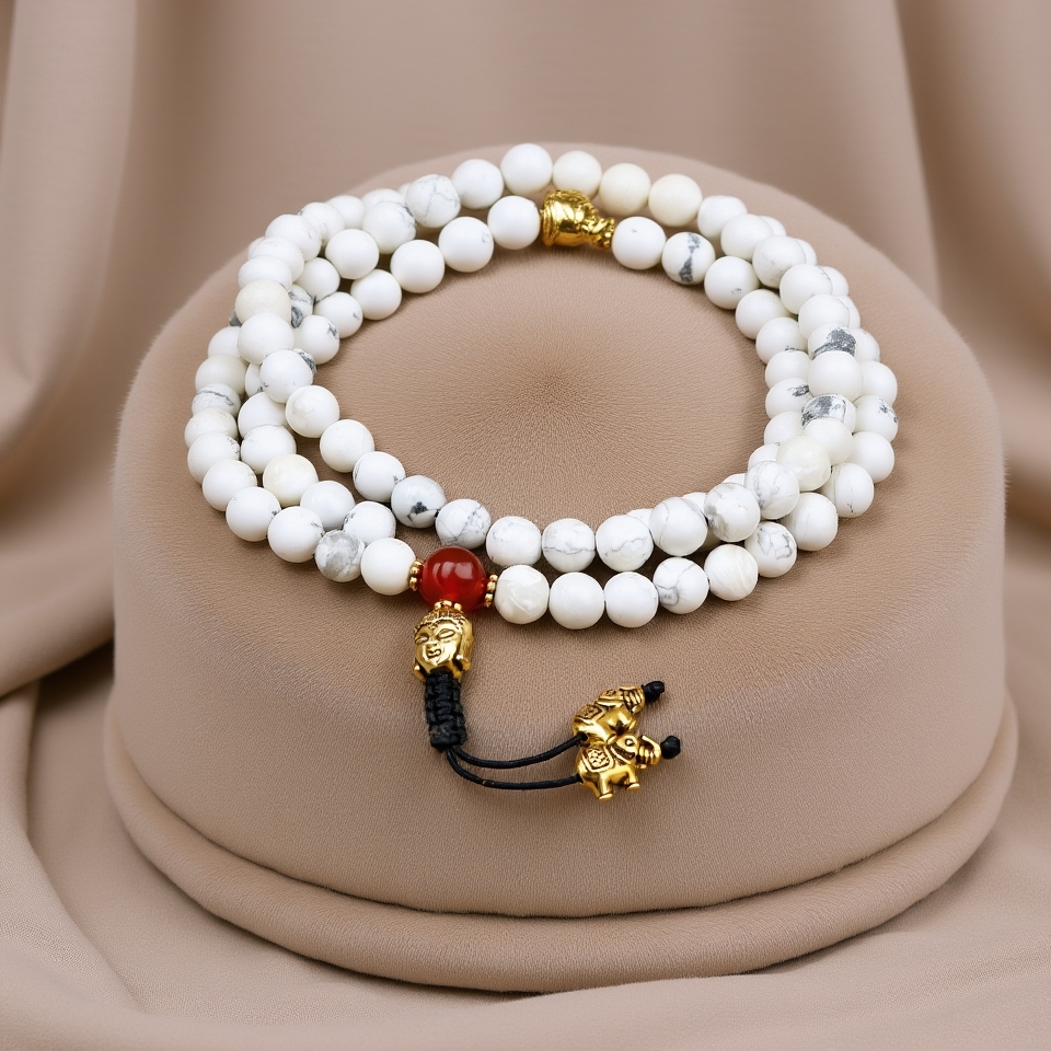 This handmade Japa Mala, crafted in Nepal by skilled artisans, features spiritual Howlite stones, known for their calming properties and ability to foster awareness. The mala includes a Buddha head and an elephant spacer, symbolizing wisdom and strength. Howlite aids in connecting with higher realms, enhancing memory, and promoting patience. It serves as a powerful tool for meditation, helping to quiet overactive minds and alleviate insomnia, making it ideal for those experiencing anger and disappointment. Embrace the transformative energy of this mala as you embark on your spiritual journey.