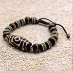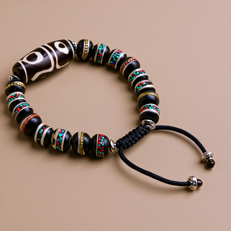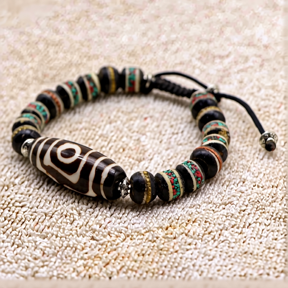 This beautifully crafted wrist mala features a mix of color inlaid yak bone and a dzi bead spacer, each element symbolizing the profound journey of life. Handmade in Nepal by skilled artisans, this mala serves as a reminder of our impermanence and encourages a life filled with compassion and joy, transcending the dualities of good and bad experiences. The yak bone, a significant material in Tibetan culture, embodies the essence of embracing change. The dzi bead, revered for its protective qualities, attracts positive energies and blessings. Together, they create a powerful tool for meditation and mindfulness.