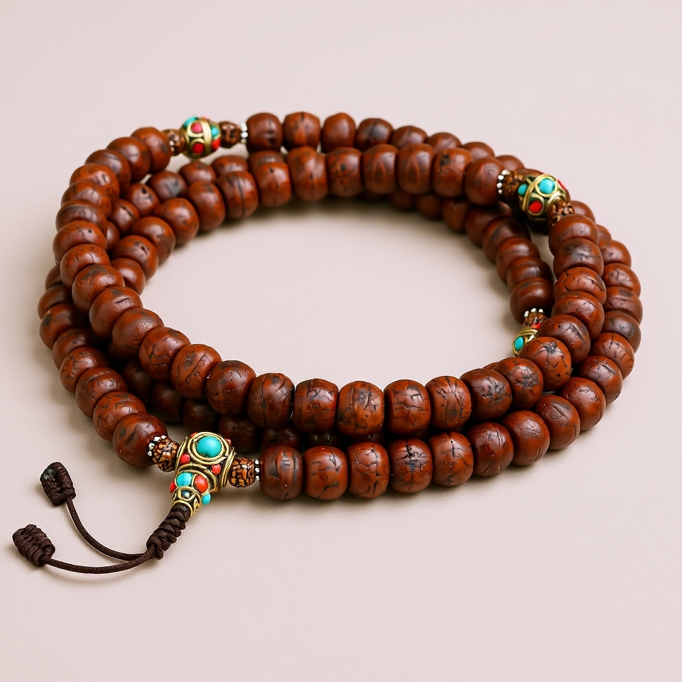Antique Nepali Bodhi Seed Japa Mala with Inlaid Brass Spacer Beads