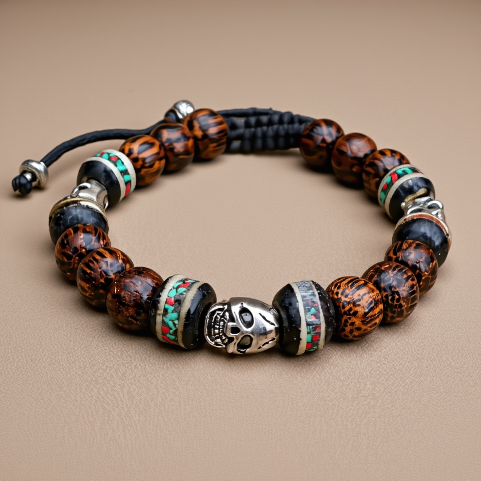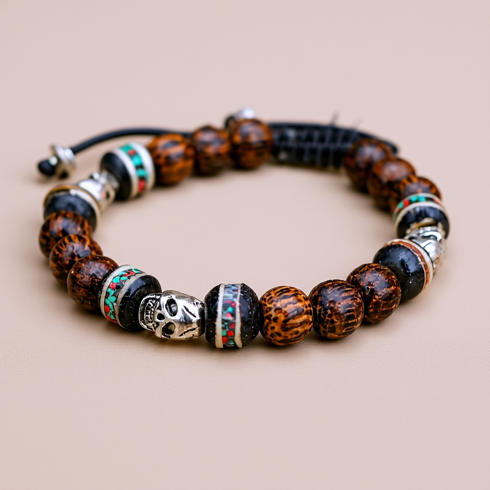 | Material: | Palm Wood with Yak Bone and White Metal skull spacers |