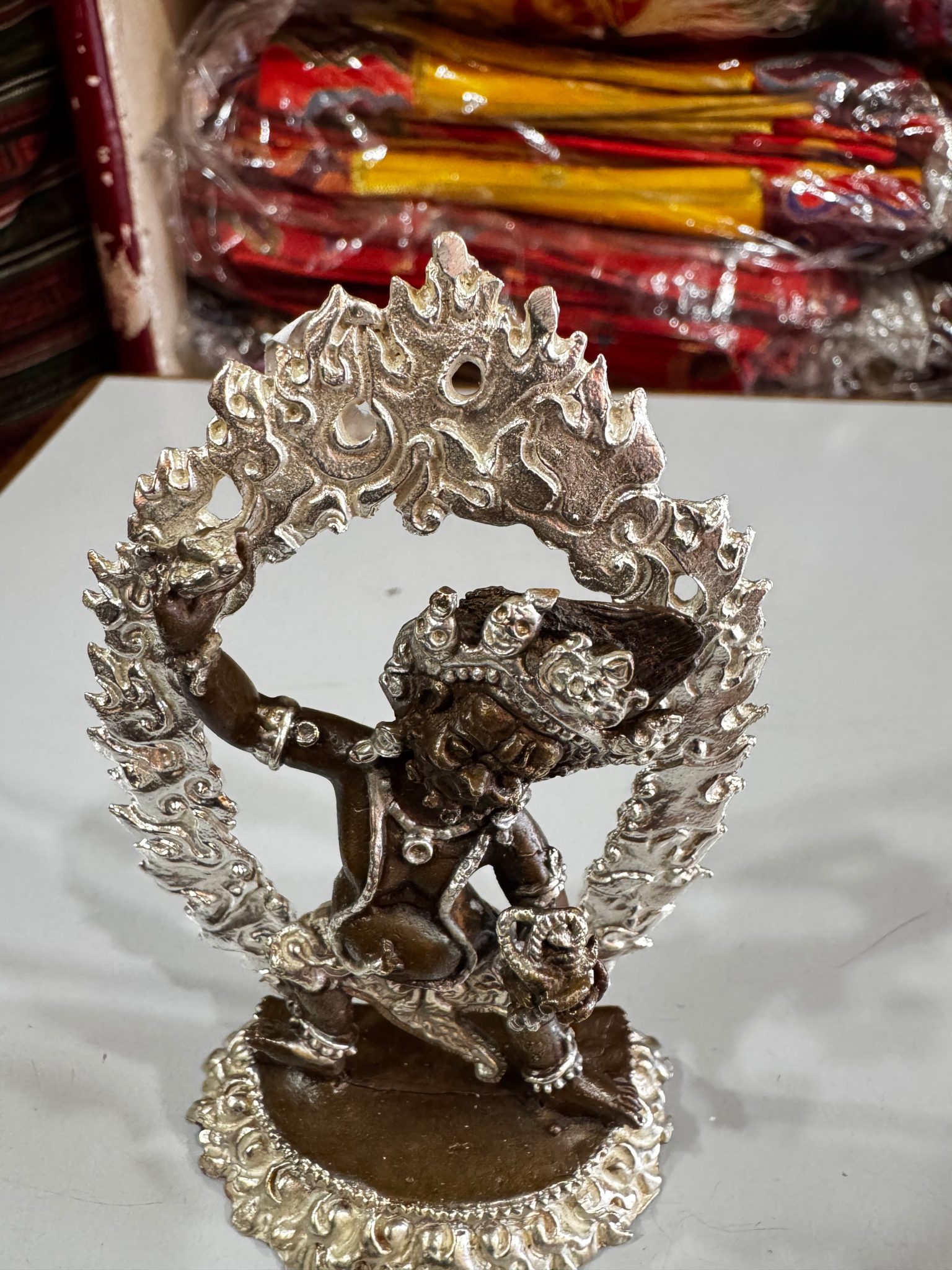 Handcrafted in Nepal by skilled artisans, this small copper statue of Vajrapani Chana Dorje embodies the strength and protection of this revered tutelary deity. As a symbol of spiritual power, it serves as a reminder of the path towards enlightenment. The statue is thoughtfully silver-plated, enhancing its spiritual significance while honoring traditional Nepalese craftsmanship.