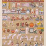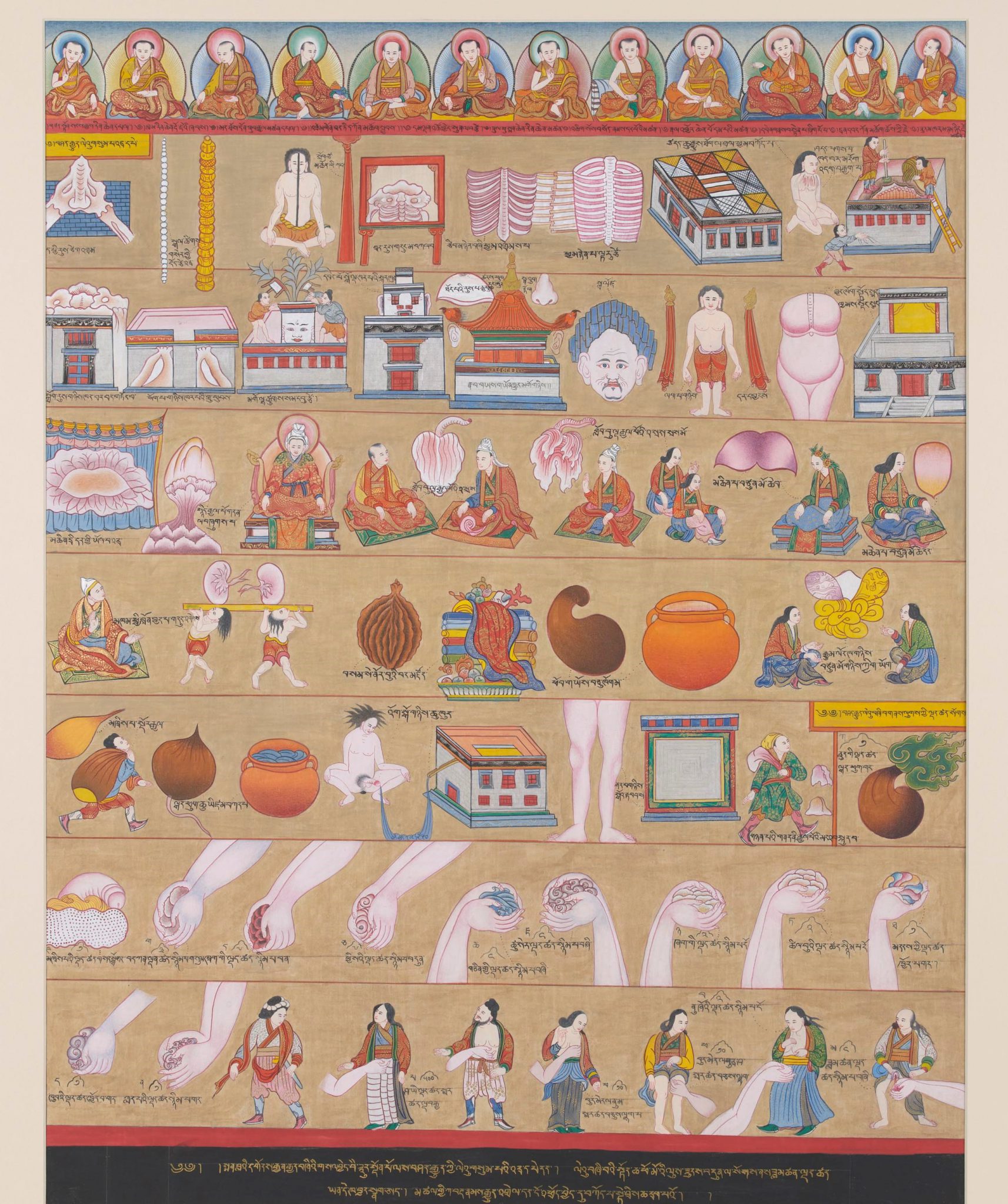 Metaphors and measurements of the human body – Medical Thangka depicts the body dimensions and metaphors that students and practitioners use to recall parts of medical books. The size of this thangka is 74*90 cm.