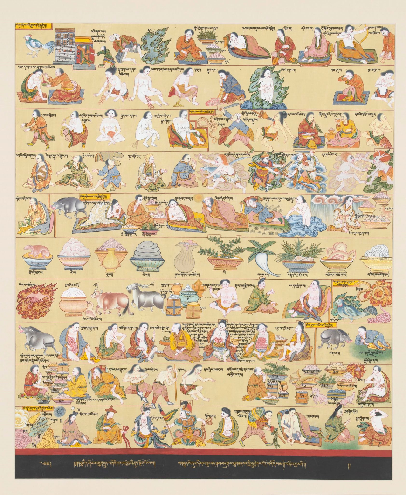Wind diseases are shown in the first section, indicated by the cock. The catalog of bile diseases begins with the image of a snake and that of phlegm diseases with a pig. Tumors are caused by an imbalance of all three touches of humor and are associated with a disparate set of other factors, including overwork – such as carrying rocks, shown here – as well as indigestion, childbirth, harmful demons, sitting on damp ground, and past deeds.