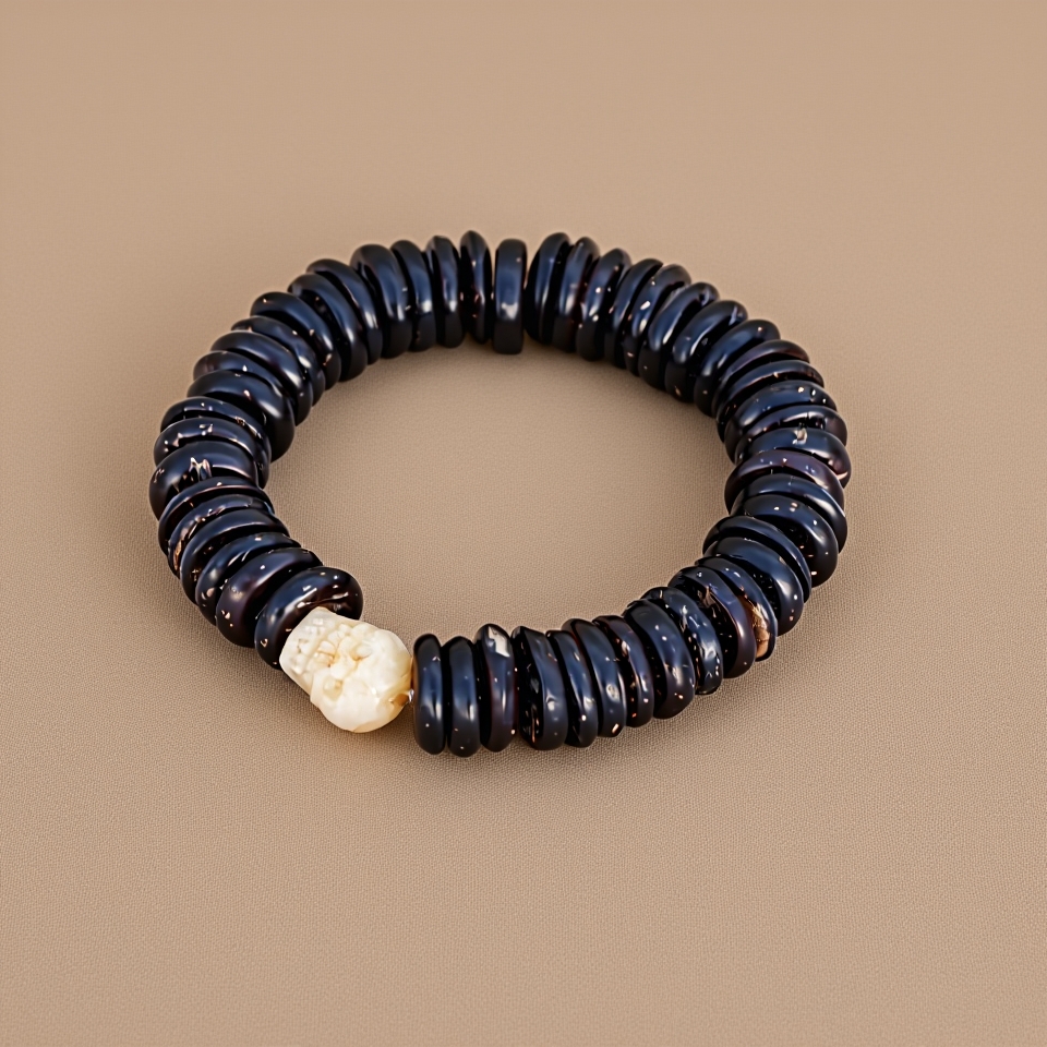 This handmade wrist mala, crafted from dark yak bone and adorned with skull beads, invites reflection on the profound teachings of impermanence within Buddhism. Each bead serves as a gentle reminder to embrace the present moment, acknowledging that all experiences—joyful or sorrowful—are transient. The yak bone symbolizes the cycle of life and death, encouraging us to cultivate awareness and appreciation for each fleeting moment. This mala, with a total length of 10 cm, is lovingly made by skilled artisans in Nepal, weaving tradition and spirituality into every piece.