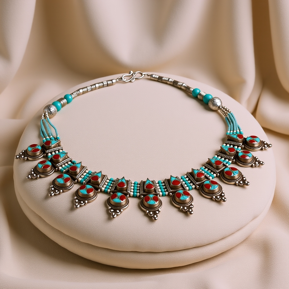 The Inlaid Stone Pendant Necklace, handcrafted in Nepal by skilled artisans, embodies the harmonious union of white metal, Turquoise, and Coral. Each stone is imbued with unique energies, fostering peace, protection, and clarity in your daily life.