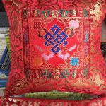 This handcrafted Tibetan silk brocade cushion cover features the timeless design of the Endless Knot, symbolizing the interconnectedness of all things. Its vibrant colors bring warmth and sacred beauty to your space, whether adorning a shrine or enhancing your living room. The zippered back allows for easy insertion of your own cushion, making it a functional and meaningful addition to your home.