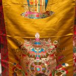 This handmade Tibetan Buddhist door curtain, crafted from silk brocade, serves as a spiritual gateway adorned with the Kalachakra and eight auspicious symbols. Traditionally found at the entrances of homes and temples across Tibet, Nepal, and Northern India, it invites blessings and protection into your space. This beautiful piece is skillfully made in Nepal by talented artisans and features three loops for easy hanging, symbolizing the interconnectedness of all beings.