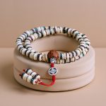 This handmade prayer mala, crafted by skilled artisans in Nepal, features white antique Bodhi seeds interspersed with yak bone beads. Each bead serves as a reminder of the impermanence of life, echoing the wisdom of Buddhism and the cycle of karmic rebirth. The yak bone symbolizes strength and resilience, reflecting the enduring spirit of the Himalayan yaks. This mala not only aids in meditation and mantra recitation but also embodies compassion and gratitude towards all living beings. A powerful tool for spiritual practice, it encourages mindfulness and transformation of negative energy.