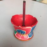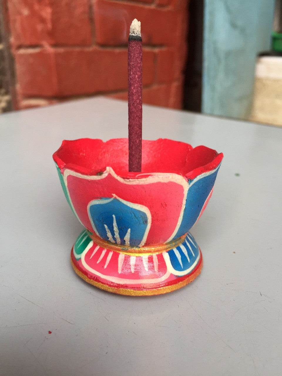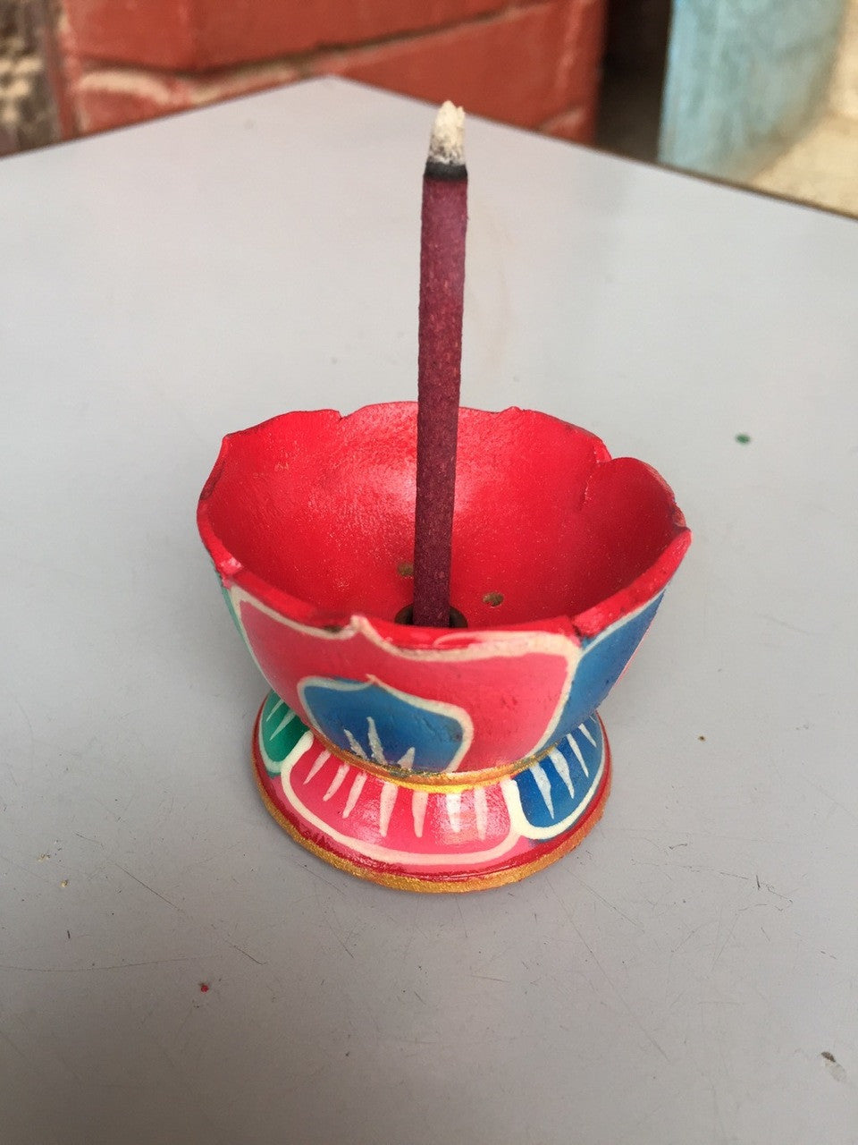 This small lotus-shaped incense burner is a beautiful expression of Tibetan craftsmanship, handmade in Nepal by skilled artisans. Carved from wood, it serves as a sacred vessel for incense, allowing the fragrant smoke to rise and purify the space. The central metal ring holds the incense securely, ensuring that the ash is collected within the holder, enhancing your meditation or prayer practice.
