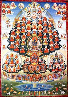 In Vajrayana, guru yoga is a tantric devotional practice in which the practitioner unites their mindstream with the mindstream of the body, speech, and mind of their guru. Guru yoga is akin to deity yoga since the guru is visualized in the same manner as with a meditational deity. The process of guru yoga may entail visualization of a refuge tree as an invocation of the lineage, with the 'root guru' channeling the blessings of the entire lineage to the practitioner. The guru may be visualized as above the meditator, in front of them, or in their heart. Guru yoga may also include a liturgy, prayer, or mantra, such as the "Seven Line Prayer" of Padmasambhava, or the "Migtsema".