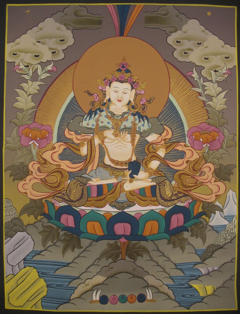 Palden Dorje Sempa is a revered figure in Tibetan Buddhism, embodying purity, compassion, and wisdom as a manifestation of the primordial Buddha, Samantabhadra. Depicted as a peaceful white deity holding a vajra and bell, symbolic of ultimate reality and wisdom, Dorje Sempa plays a central role in purification practices. Practitioners invoke him to cleanse negative karma and afflictions, reciting his mantra "Om Vajrasattva Hum" to purify the mind and cultivate compassion and clarity. Widely practiced in Vajrayana Buddhism, Dorje Sempa's purification ritual is cherished for its ability to purify negative thoughts and emotions, fostering spiritual growth and transformation among practitioners worldwide.